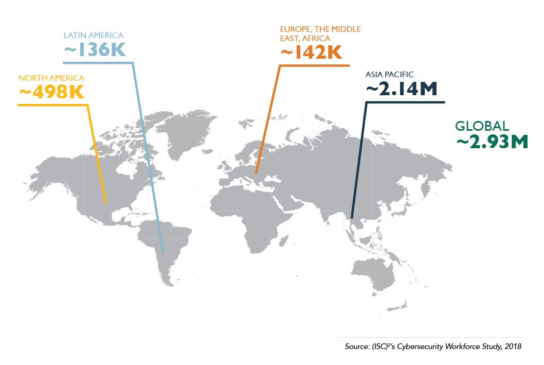 Lack of experts in 2018 IT security according to regions; source: (ISC)'s Cybersecurity Workforce Study