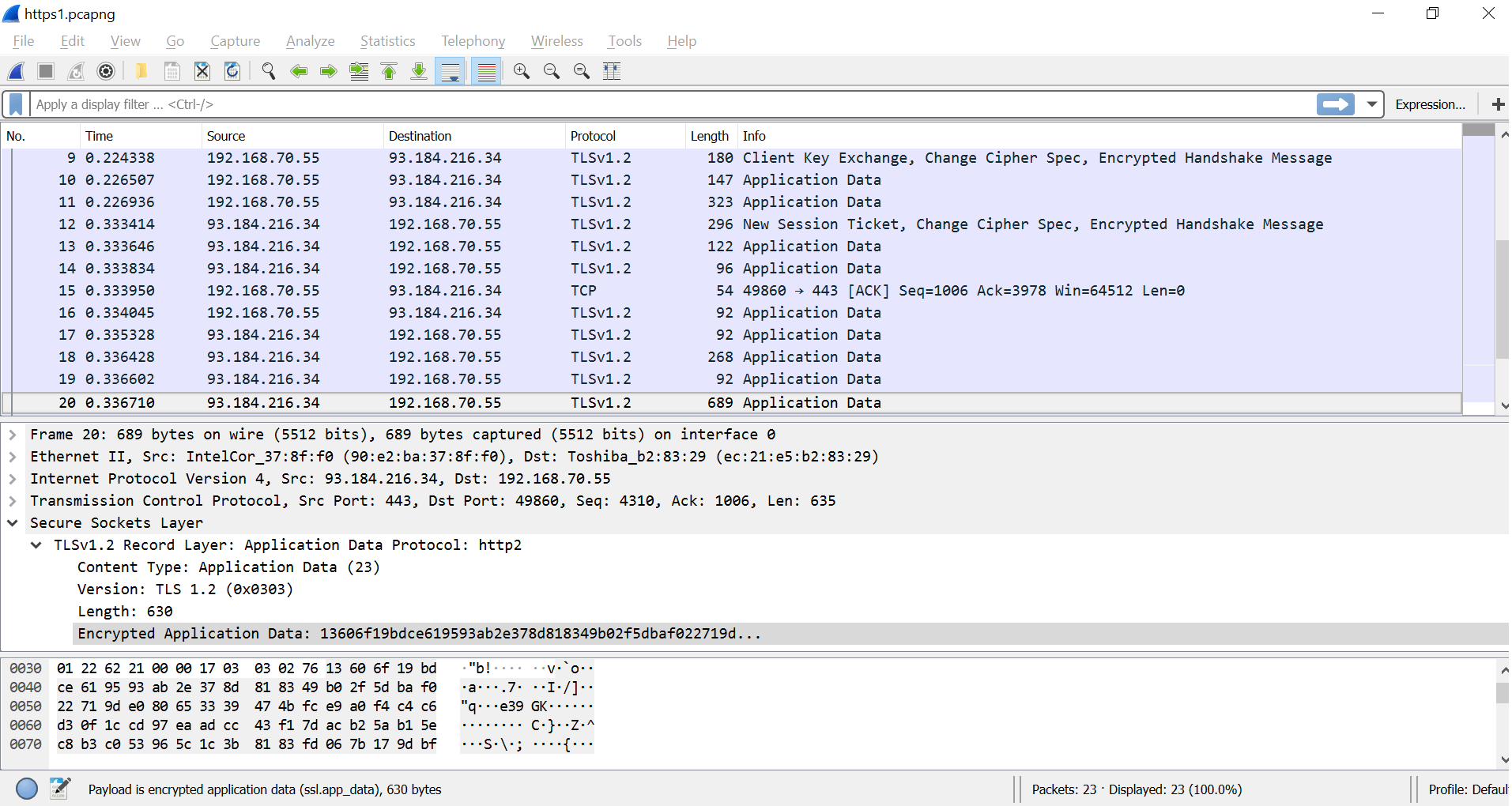 How will our communication with example.com look like if we use HTTPS? Here is a screenshot from Wireshark when we visit https://example.com: