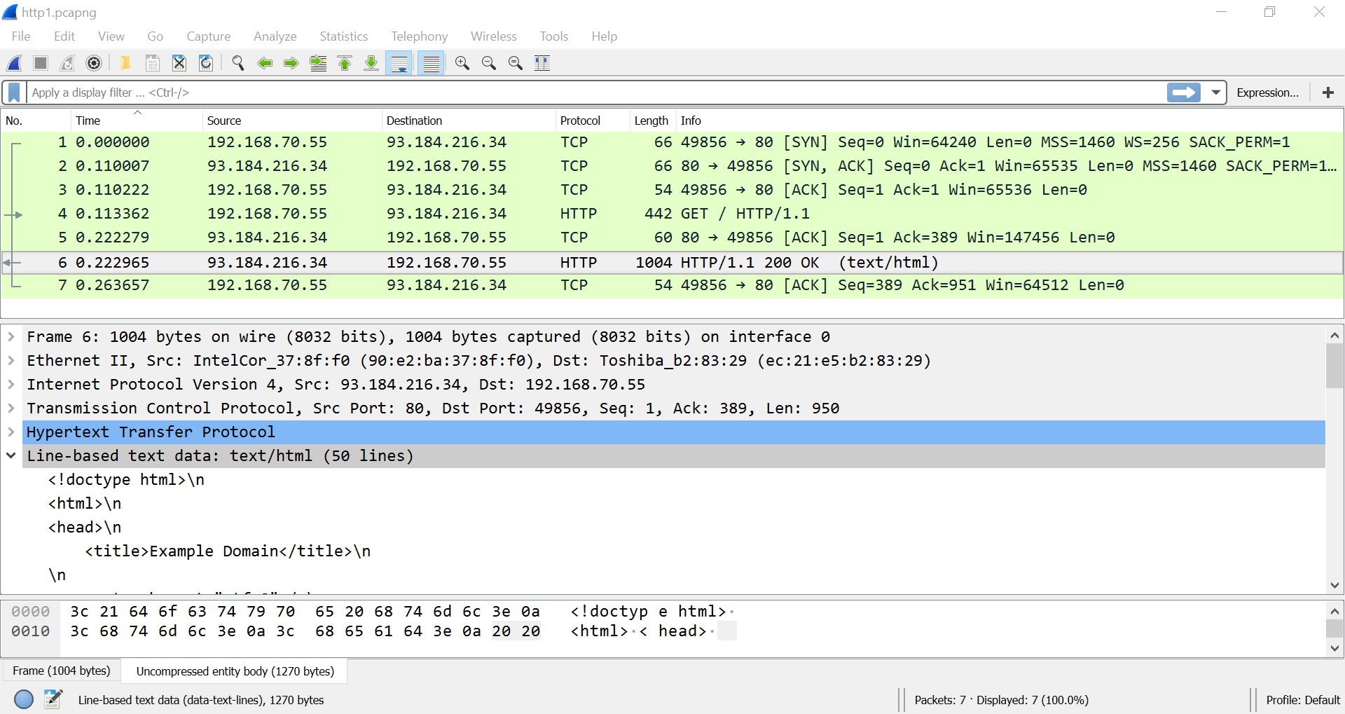 Using encryption it is no longer possible to inspect the content of the communication. Let's take a look at the following screenshots from a popular packet capture tool - Wireshark. Let's visit the website - example.com. At first, without encryption (plain HTTP) - http://example.com. In Wireshark we can dive deep and inspect the HTML code of the website content being transmitted from the server to the client. Anybody can intercept our communication and take a look themselves: