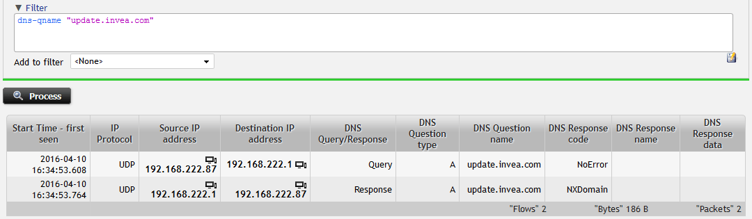 Again, let’s see an example. A user is complaining about an unresponsive service. By analysing traditional flow data we can see the traffic pattern and details about individual connections established by the user’s computer. Nothing seems to be wrong but we cannot see any traffic towards the service. Having extended visibility - provided by Flowmon’s enriched flow data engine - in place we can easily troubleshoot why. The requested service name is not properly configured in DNS service and returns “NXDOMAIN”, which indicates that the requested domain name does not exist and the corresponding IP address cannot be provided. Therefore, no session is established.