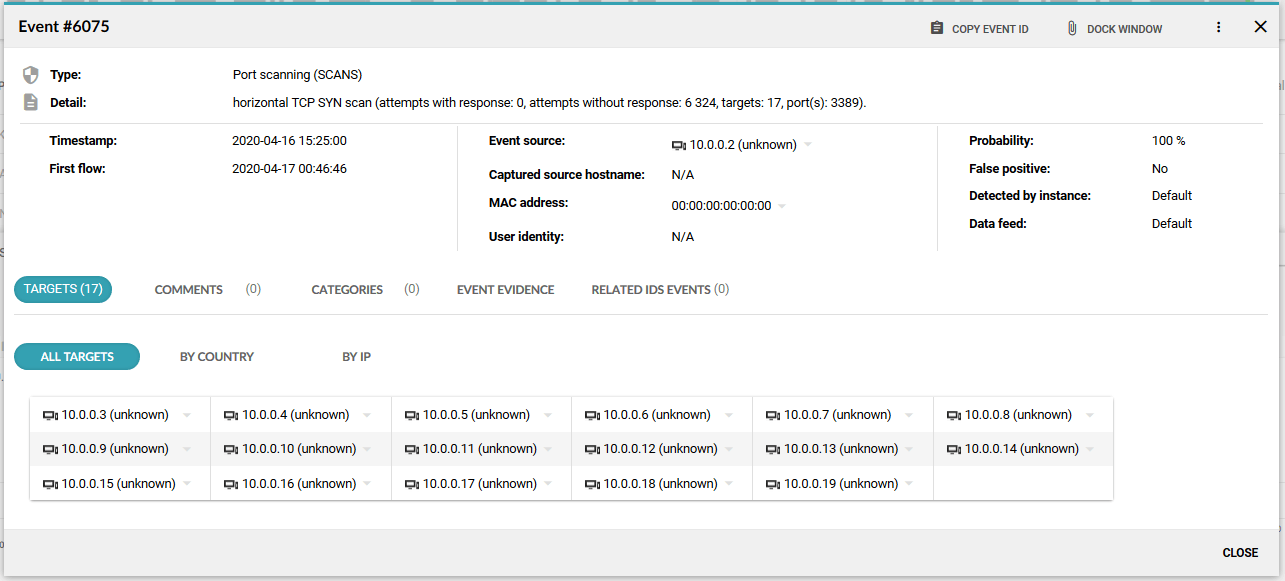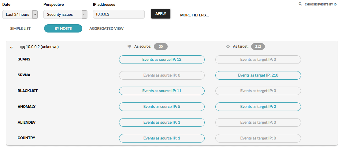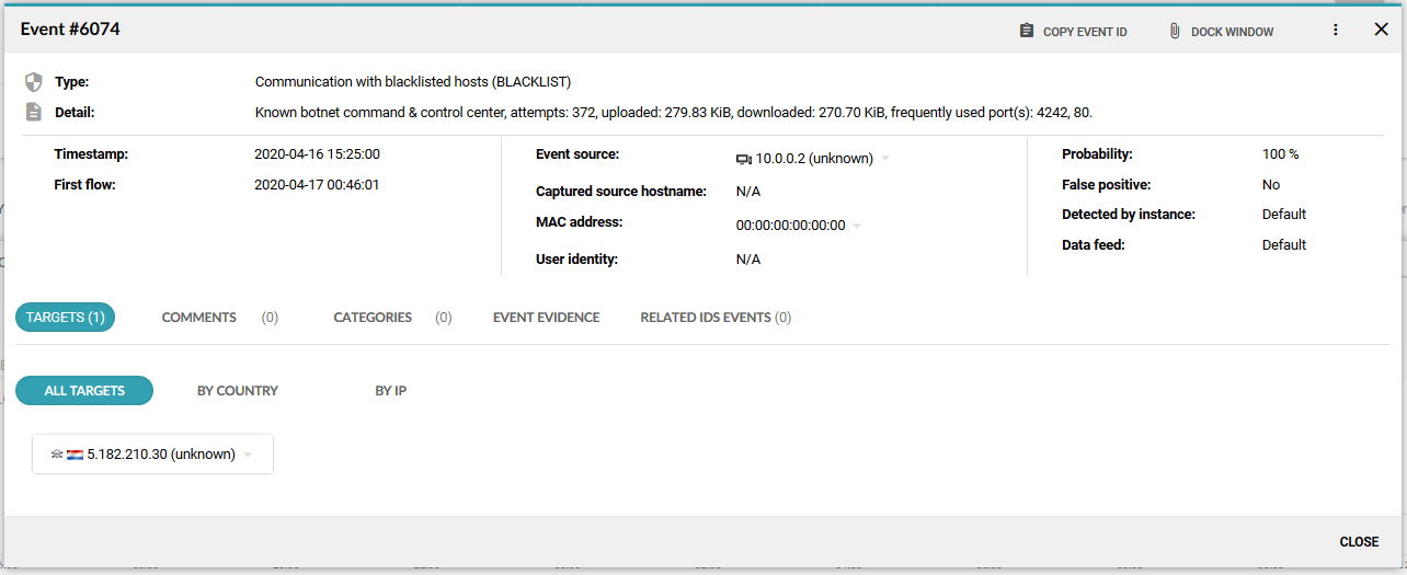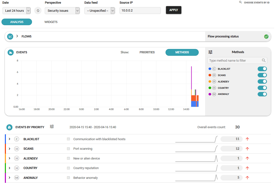 Security analysts can now investigate the incident. In Flowmon, we have quickly filtered a list of all events related to this IP address.