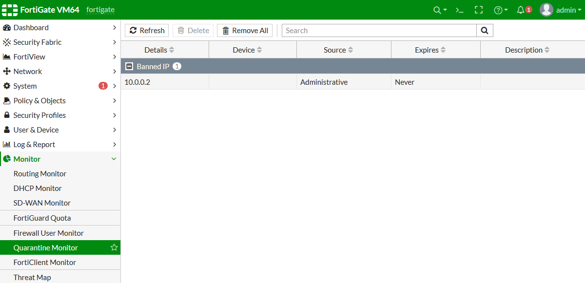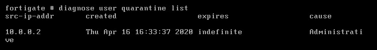Before any infiltration attempt was successful, Flowmon had connected to FortiGate and provided instruction to quarantine the infected laptop with IP address 10.0.0.2. The new rule was successfully implemented, as we can see in the FortiGate Quarantine Monitor. This action blocks the network activity on the perimeter (north-south) where the FortiGate firewall is located and does not stop the potential spread of infection on the local network (east-west). Blocking the north-south traffic cuts off the communication with the botnet command & control center or attacker remote access channel and prevents data exfiltration or additional download of malicious content. This action prevents the most severe damage and creates reasonable conditions for the security team to contain the threat.