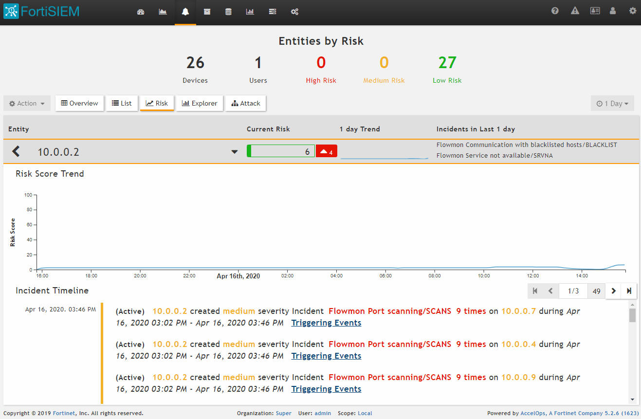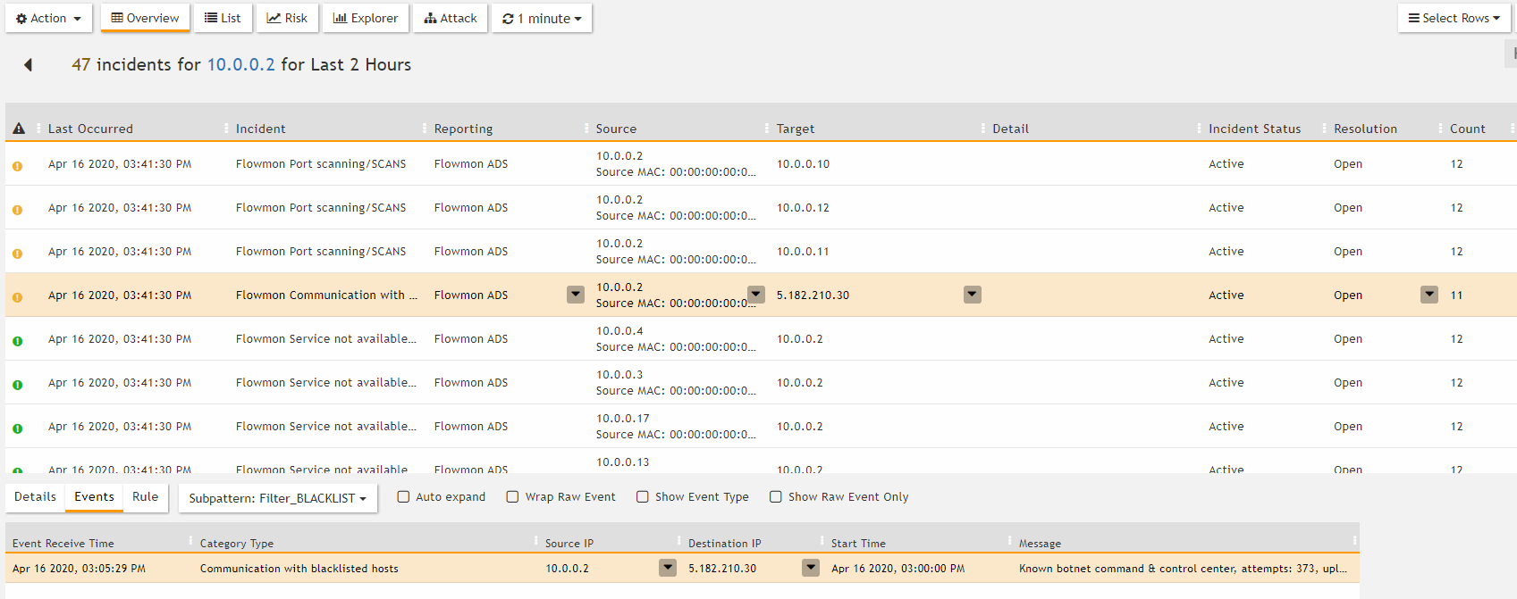FortiSIEM collects events from Flowmon using Syslog in CEF format and further sorts, correlates, and reports on them. In the example below, we see an overview of incidents created for one single entity (IP address).