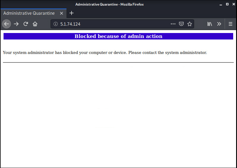 When the user accesses the internet, their access is blocked, and FortiGate shows a message that the device was blocked by the administrator.