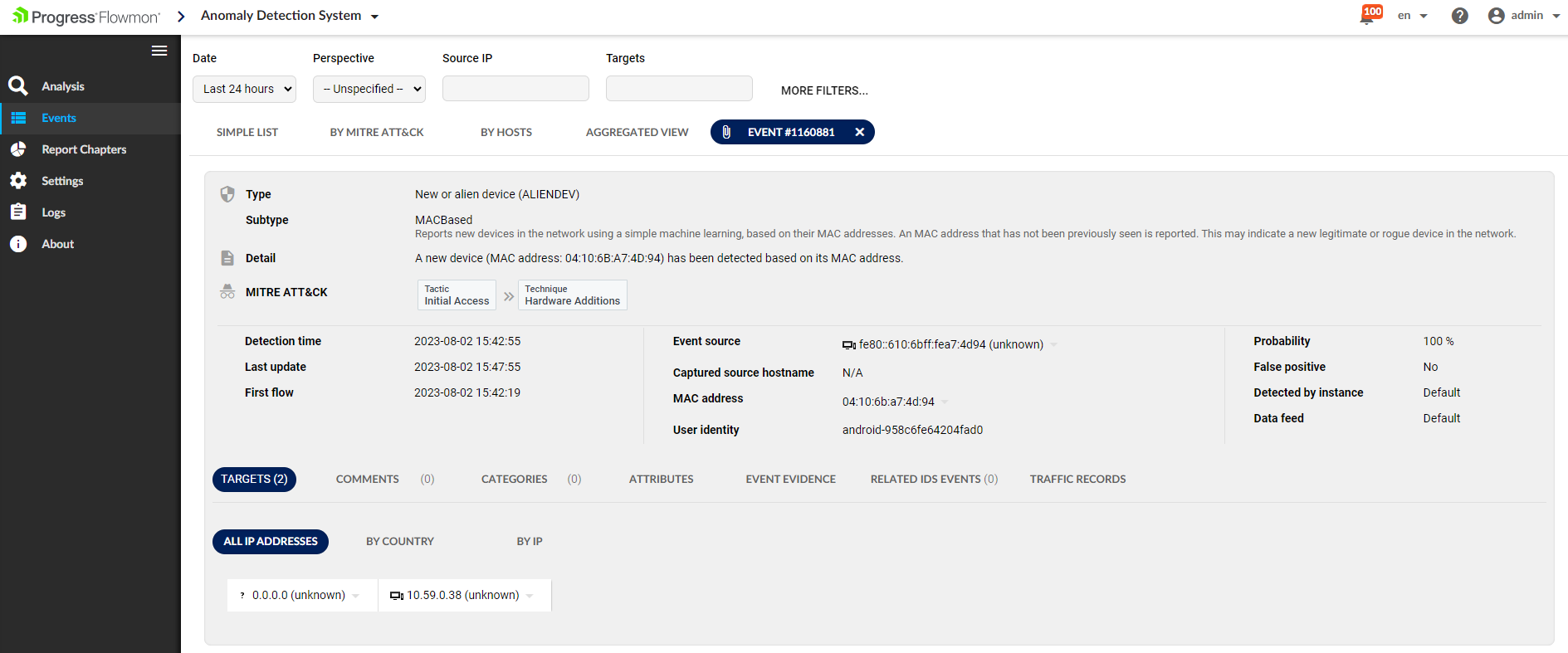 Most important information is highlighted. There is an active link from event ID which leads to event details in Flowmon ADS. This event represents a situation when a new, previously unknown device, is connected to the network.