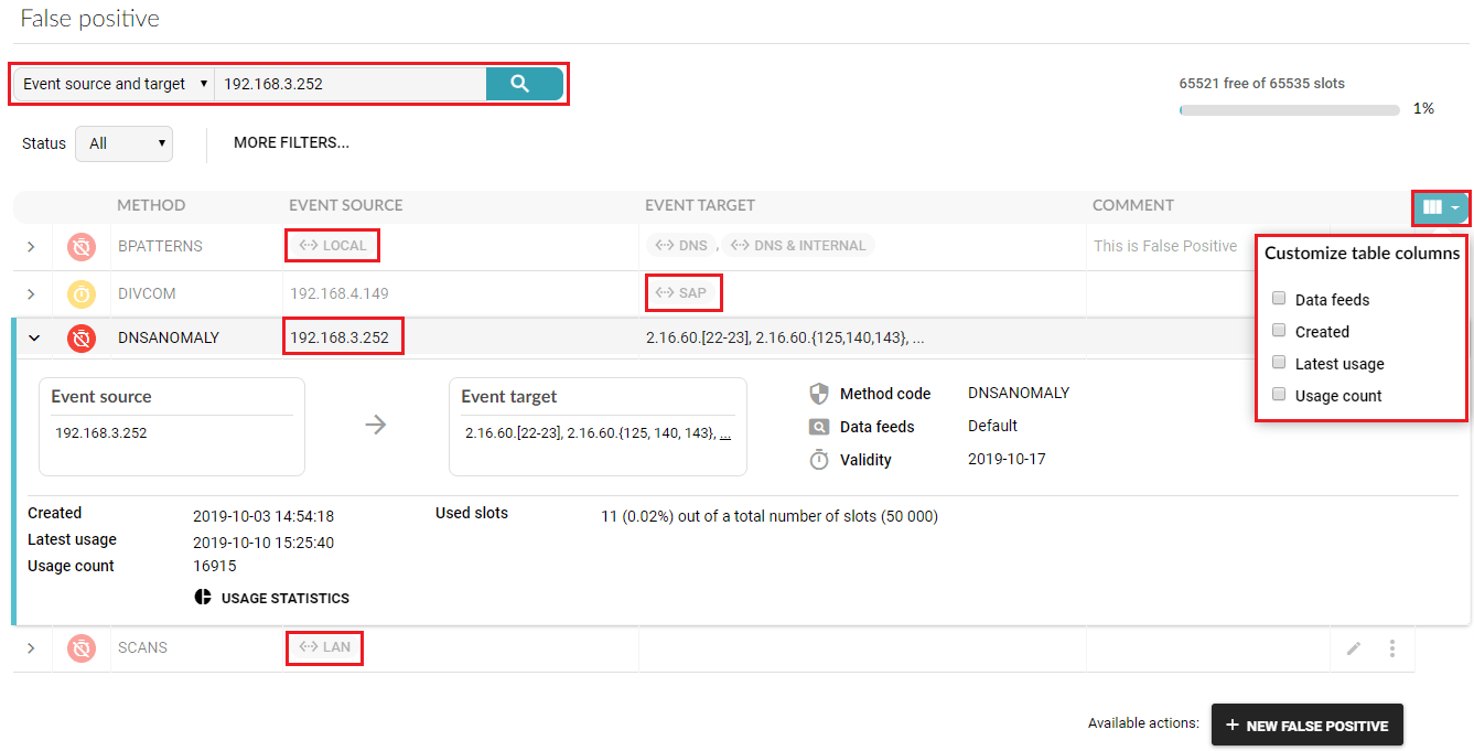 False positive rules are now configured from one page and allow full-text search as well as search by IP address, which may be part of an existing filter. In order to speed up fine-tuning, the system allows deleting only more recent false positive events.
