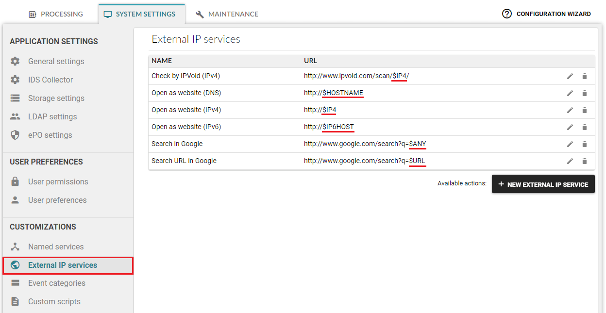 To adjust the system to your needs, you can add your own reputation feeds or blacklists. In addition, the system accommodates external services, allowing for IP addresses to be checked by IPVoid, googled as a URL or opened as a website.