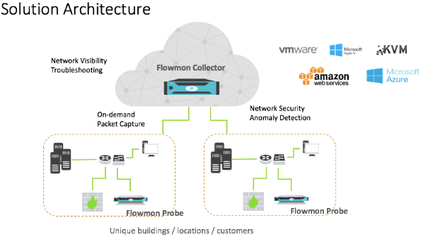 Flowmon addresses this monitoring requirement in a non-intrusive (agentless), technically scalable, and financially friendly OPEX model via our world-class network analytics solution. Let me explain a typical installation that allows immediate value and provides for ultimate scalability as you include new offices or locations.