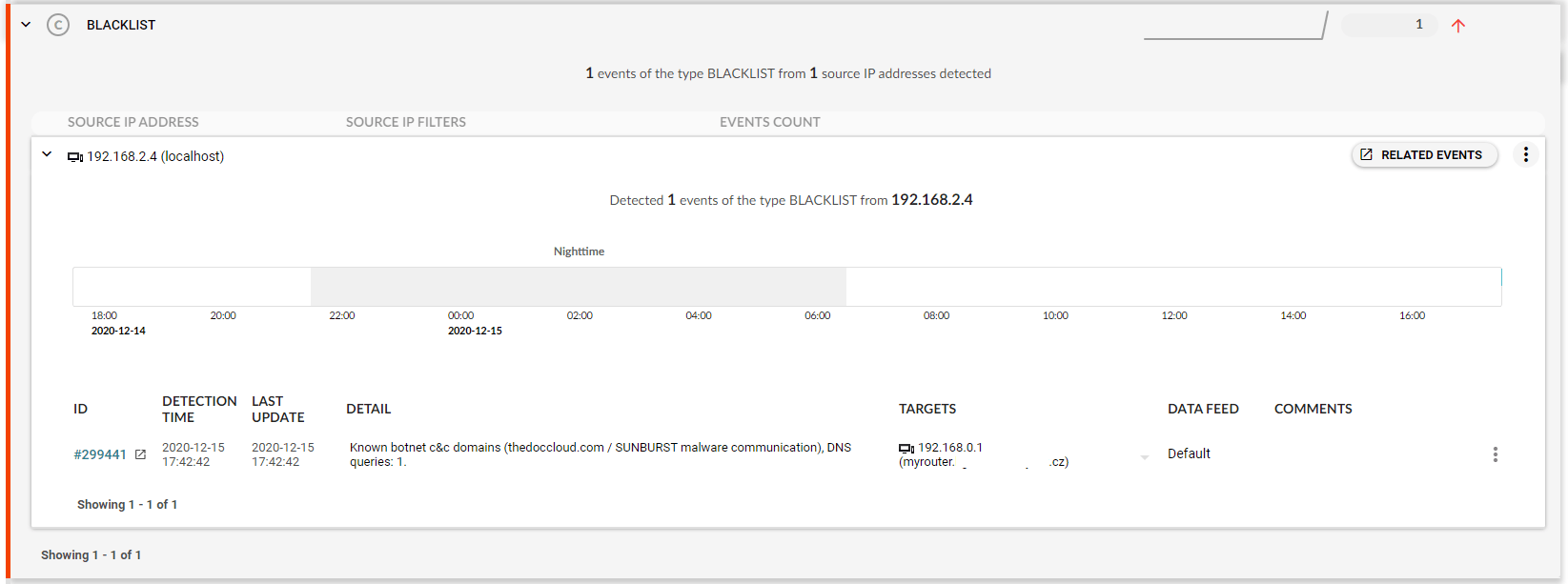 On top of the standard detection methods, Flowmon contains a set of Indicators of Compromise to detect SUNBURST specifically. Your Flowmon appliance will download them automatically (assuming it is connected to the Internet) and you may use them to prevent the infection or check whether it isn’t in your infrastructure already.The attack is detected as a BLACKLIST event that alerts you to communication with a known botnet command and control center (see figure 1) while the detail of the event shows specific malware or botnet family that is attributed to the indicator of compromise. In this case SUNBURST.