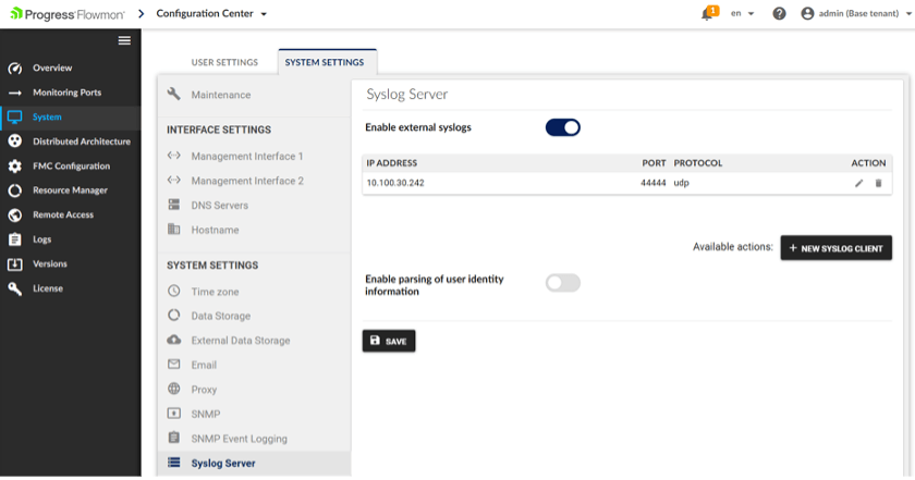 On the collector side, we need to configure Syslog Server. Navigate to Configuration Center > Settings > System Settings > Syslog Server. Enable external syslog and add new syslog client. Enter the IP address of the Flowmon Probe, use the same port and protocol and save.
