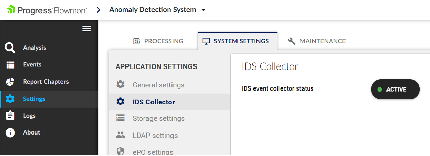 Now the probe is sending IDS events via syslog and collector is receiving it, but to process, store and visualize it, we just need to do one more thing. Go to the ADS Settings and in the System Settings > IDS Collector click on ‘Activate’ button. After this is done, you will be able to see IDS events on the Analysis page.