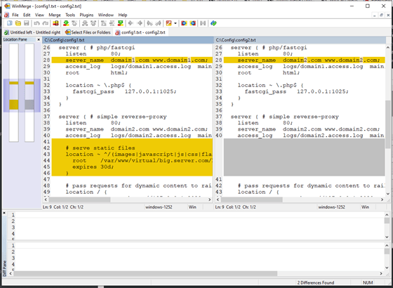 Once the files are loaded, you will see that there are yellow sections that highlight the differences between the files. These are easy to see because of the minimap shown on the left-hand side. In our example below, there is a section missing from the right-hand config2.txt file. Instead of shifting all of the following lines down and marking the rest of the file as changed, WinMerge is smart enough to detect the changed lines and show that only that section has changed.