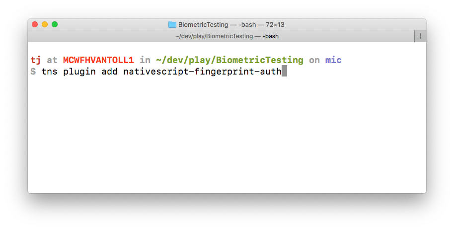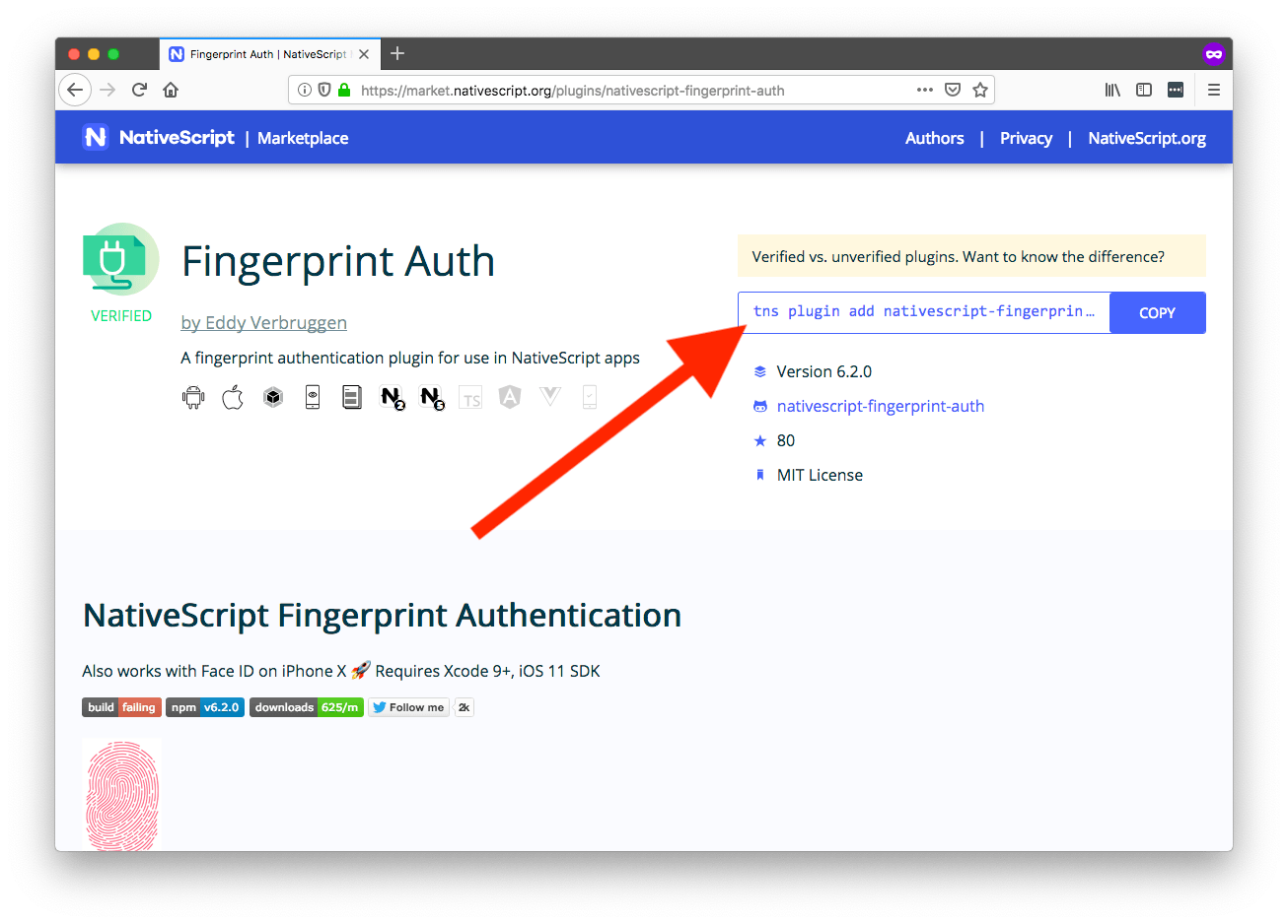 For iOS and Android biometric authentication, you’ll want to search for the NativeScript “Fingerprint Auth” plugin, which is a plugin that gives you access to fingerprint sensors, Touch ID, and Face ID. Once you have the plugin’s page up, copy the installation command on the right-hand side of the screen.