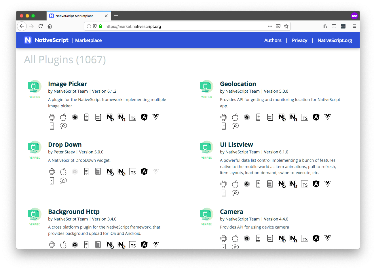One of the big benefits of using NativeScript is you have access to a huge library of free and open source plugins in NativeScript Marketplace. Each plugin allows NativeScript developers to tie into native functionality through JavaScript or TypeScript APIs.
