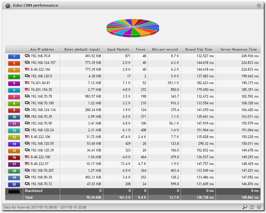… or top statistics with hosts experiencing the highest Server Response Time in the widget below which also includes Round-Trip Time (RTT) – delay introduced by the network. Notice that hosts connected to wi-fi (networks 192.168.120.0/24 and 192.168.124.0/24) have slightly higher RTT (about 10ms higher) compared to hosts in the LAN (network 192.168.70.0/24). This is something you would expect but now you have in hands real measurement and you know real impact.