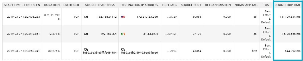 As a result, we get a list of network connections with the highest RTT. The first two rows are no surprise as they represent communication between internal IPs and servers located on the public internet where high RTT values are expected.