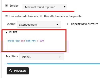 Now adjust the time window and use a filter to look for specific traffic. For example, let us search for traffic with RTT higher than 500ms and sort the results by the worst value by the Maximal Round Trip Time.