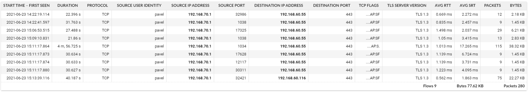 Figure 6: Application requests for user “pavel” presented with network performance metrics (round trip time aka network delay and server response time aka application delay). User identity is part of the individual flow records.