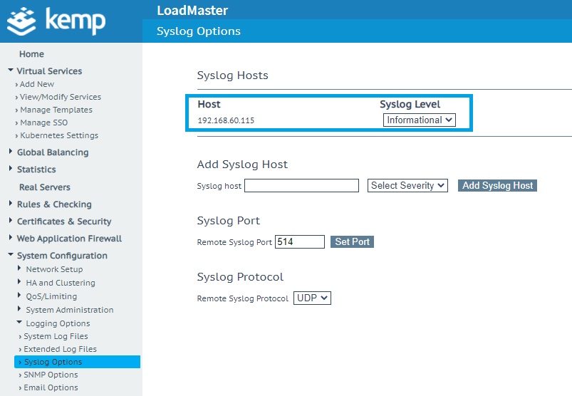 Figure 4: Flowmon Collector using IP address 192.168.60.115 configured as syslog export target from LoadMaster