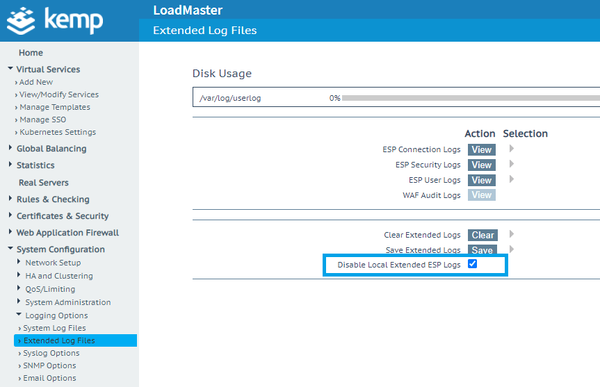 Next, you need to configure the LoadMaster to export ESP logs to an external system over syslog instead of logging them locally.