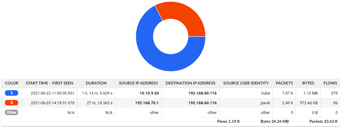 In this way, you can pair specific users with the corresponding network traffic and application transactions when investigating performance issues, providing reports or performing root cause analysis. User identity is an integral part of the traffic statistics, available for filtering, querying the data or being embedded into reports such as the following example.