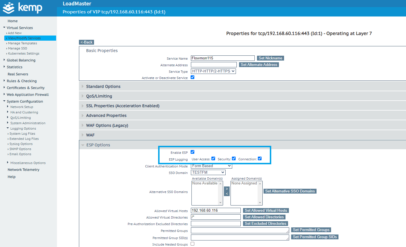 But first things first. Let’s take a look at how to configure a LoadMaster and Flowmon in order to seamlessly work on providing user identity awareness. You need to enable the ESP on top of the application workflow so the LoadMaster will authenticate users and is able to provide authentication logs. For more details on what the ESP is and how to use it, please refer to online documentation.