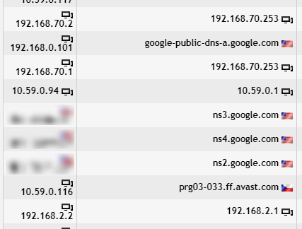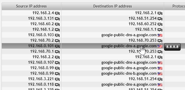 There are a couple of results with Google public DNS. Hovering over reveals IP address 8.8.8.8. Let’s exclude these from our results (and while we are at it, we might also exclude 8.8.4.4). We can list both addresses or use the network expression “not dst net 8.8.0.0/16”.