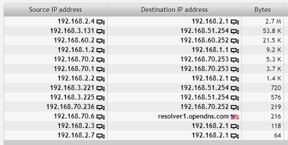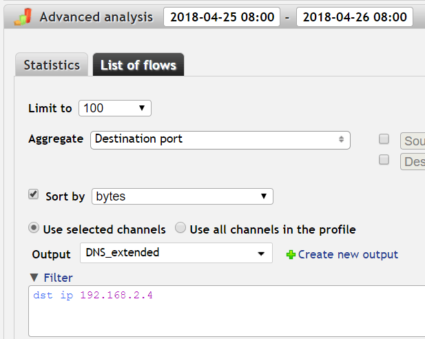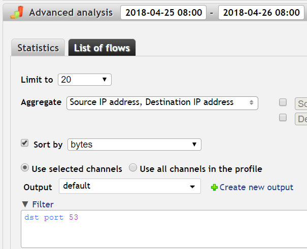 Select the time interval (we'll use the last 24 hours in this example) and Limit results to 20, Aggregate by both source and destination IP and Sort by bytes. Use the default Output (want to see both IP addresses) or create your own with the columns you want (more in Flowmon User Guide, Chapter 7.6.9 List of flows).If we look at the