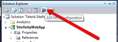 ASP.NET again provides a tool to do this, but in Visual Studio, rather than the command line. To access it, find the ASP.NET configuration button in the Solution Explorer, after you've opened your project in Visual Studio: