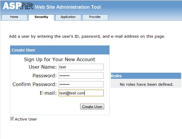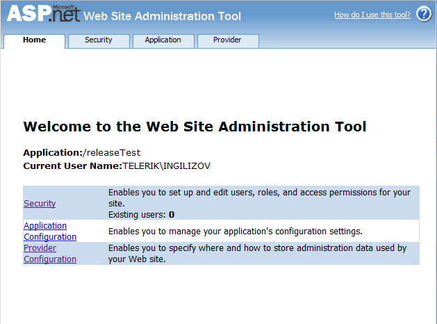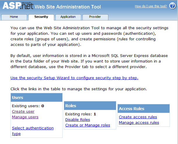 We can manage users and roles by clicking on the Security tab. This tool uses the project's web config file to retrieve information about your providers, so if you encounter any error here, the most likely cause is something in your web.config.