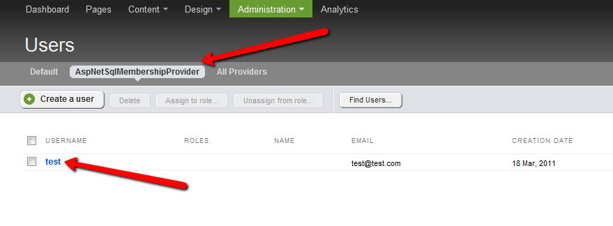 Up to now, we've created the membership database needed by SqlMembershipProvider, registered the provider with Sitefinity, and created a sample user in this provider. However, we still cannot log in with this user, because of missing rights to access the backend. To fix this, we need to assign the new user to a Sitefinity role able to access the backend. Logging in with an existing CMS user, we should be able to see the new provider and the newly created user.