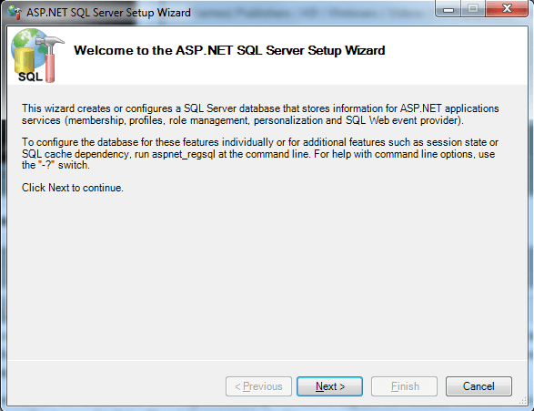 If you are moving an existing solution, you've probably already performed this step. For the purposes of this sample, we're going to use an empty database and create the tables needed by the SqlMembershipProvider to store data. The most convenient step to do this is to use the aspnet_regsql.exe tool that ASP.NET provides for us. If we run it without any command-line option, it opens a wizard that guides us through the process: