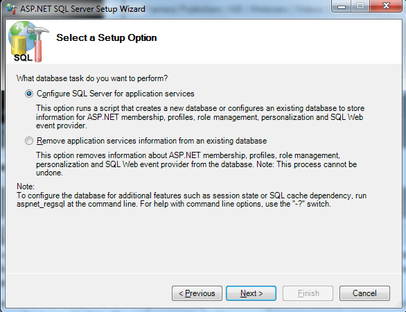 This wizard is used by ASP.NET to either create the needed tables needed by the provider, or remove them if they are no longer necessary. We need to select the former option in the second step.