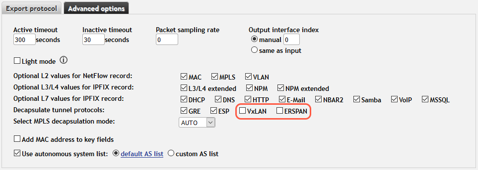 Flowmon Probe can now monitor traffic encapsulated by the VxLAN protocol used in cloud environments to address scalability issues. The probe’s monitoring port can also be used as a destination of ERSPAN or GRE session. ERSPAN is encapsulated in GRE and can be simply used to send (mirror) network traffic from switches to the monitoring port of the Flowmon Probe. Using ERSPAN, we are able to overcome the issue of getting a copy of network traffic in cloud environments.