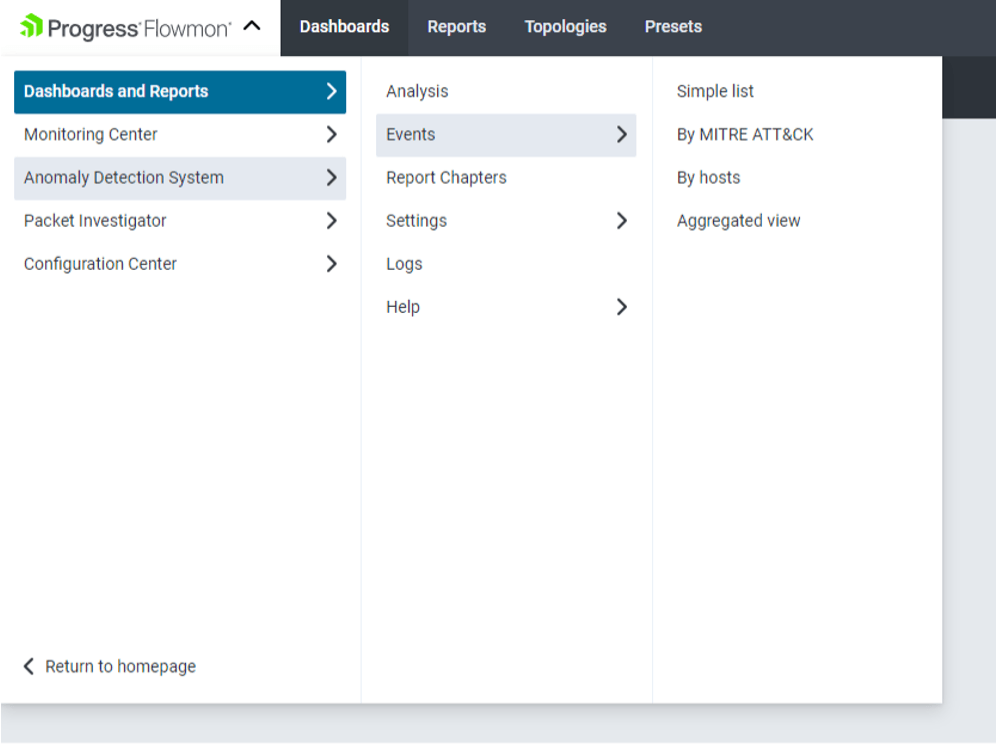 New Navigation Menu for Dashboards and Reports - This release improves ease of use and the user experience by unifying and simplifying access to the feature screens in Dashboards and Reports. A new menu on the left side of the console (see picture below) makes it easier to navigate quickly through Flowmon platform across all the installed modules.