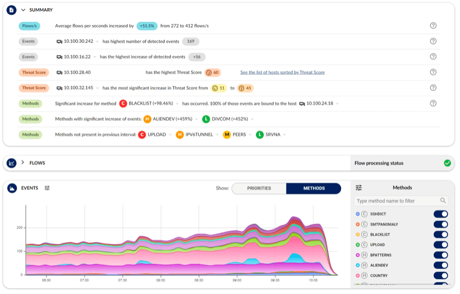 The summary compares the selected period with the previous one of the same length, allowing users to see what has changed, the most important threat actors or hosts of interest and how the security situation evolved and changed.