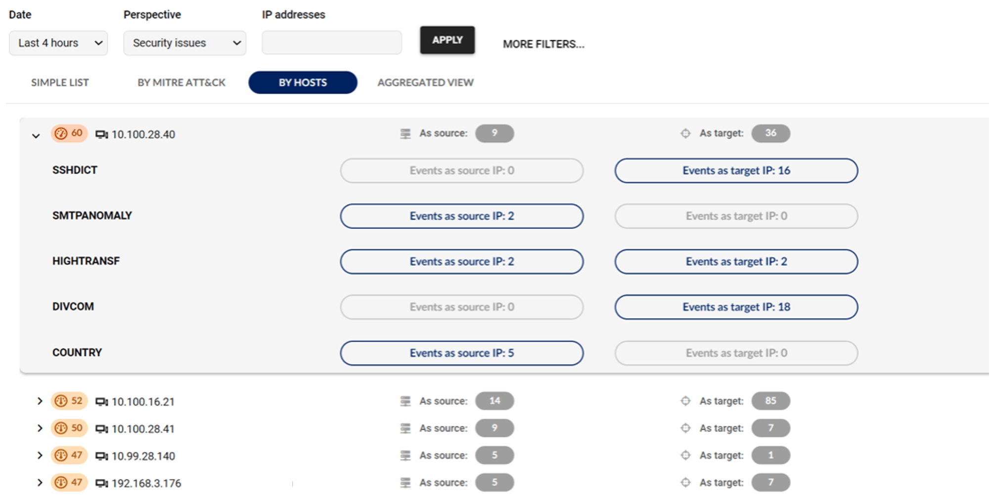 Threat score is calculated for all IP hosts on the network so that ADS can sort the most concerning hosts to the top of the list for cybersecurity teams to see and deal with quickly. Another update in this release is that sorting of the BY HOSTS view now uses the threat score to help cybersecurity defenders see the most significant threats to the network (see image below).