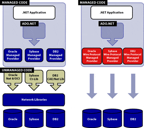 The following figure shows the difference between using a managed data provider that calls the client library and using a Wire Protocol managed data provider that connects to the DBMS with no intervening unmanaged code.