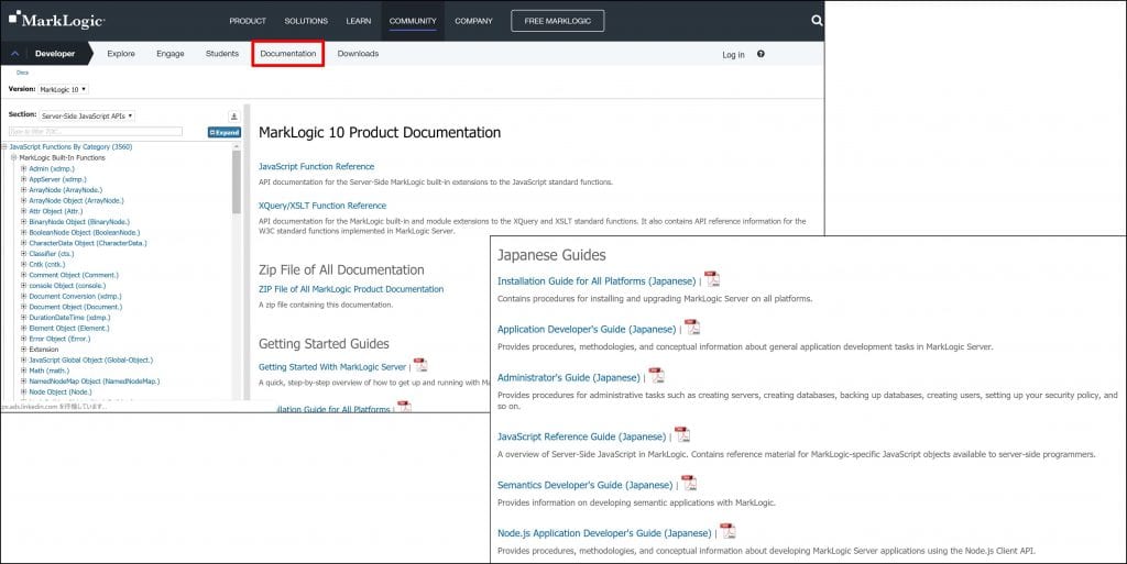 MarkLogic のドキュメンテーションに関するランディングページとなっています。左上の「Section」から選択することで、API ドキュメンテーションや各種ガイドへのアクセスが可能です。右側のメインページをスクロールダウンしていくと、「Japanese Guides」というセクションが設けられており、日本語翻訳済のドキュメンテーションの一覧を確認することが出来るようになっています。(順次追加予定)