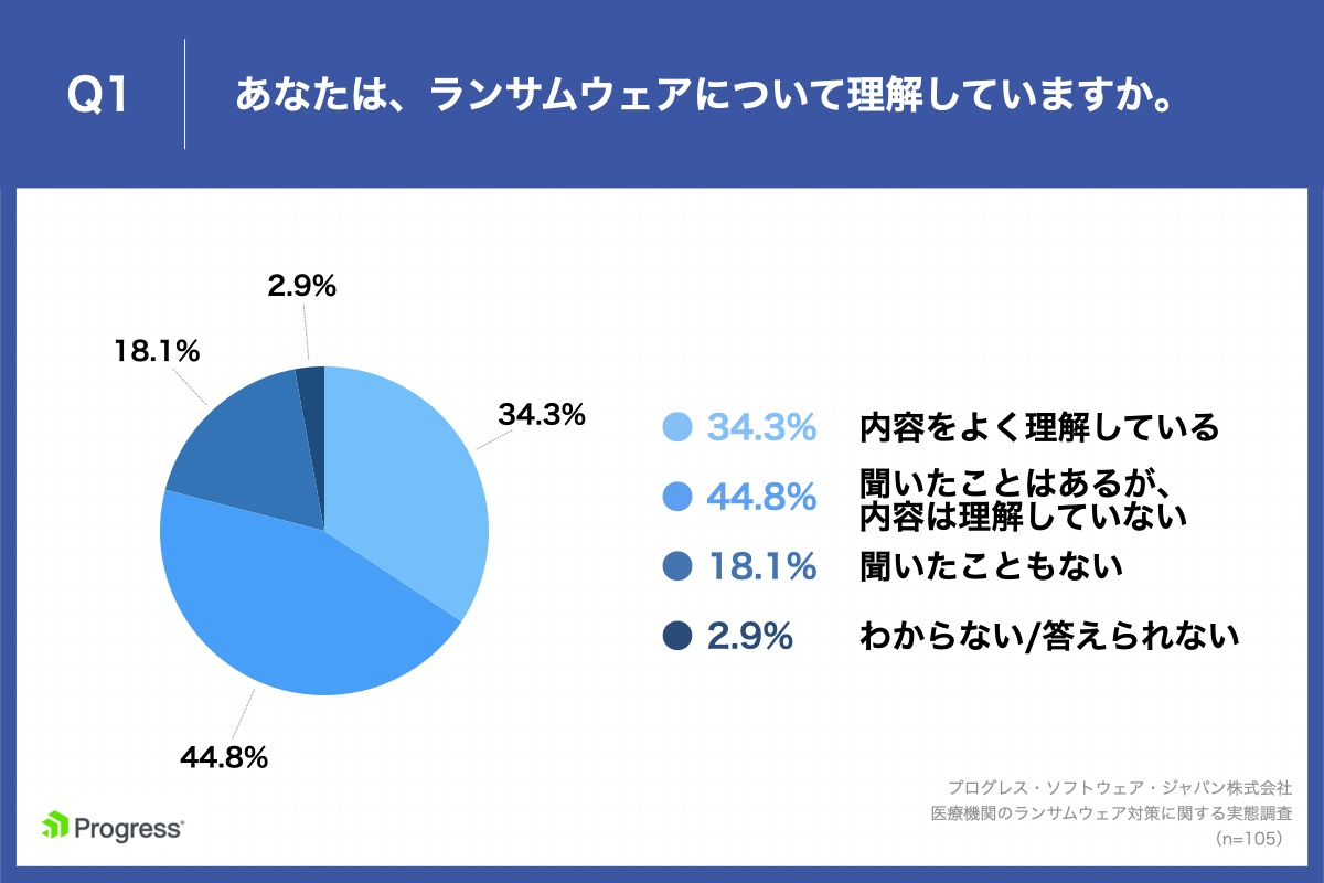 この調査では、最初の設問「Q1」で「あなたはランサムウェアについて理解していますか」と尋ねています。これに対し「よく理解している」と答えたのは、全体(n=105、nは回答者数)の34.3%にとどまりました。