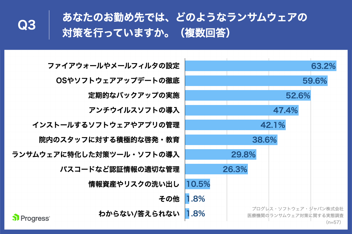 とはいえQ1で回答者の6割がランサムウェアについて十分な知識を持っていないと答えていることを考えると、この数字だけで医療機関でのランサムウェア対策が進んでいると判断するのは、やや早計と言えそうです。