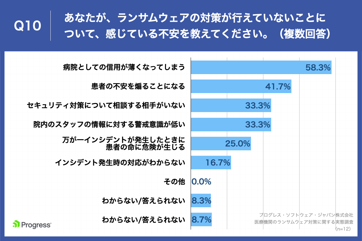 またQ2で、ランサムウェア対策を「行っていない」と回答した上で、Q8においてランサムウェアへの不安を「かなり感じている」「やや感じている」と答えた方に不安を感じている理由を尋ねた「Q10」(n=12、複数回答)では、
