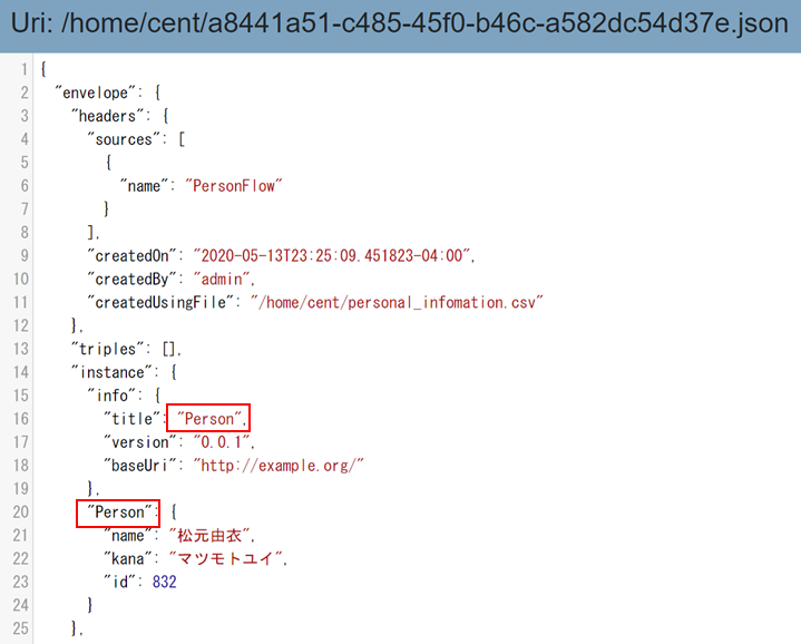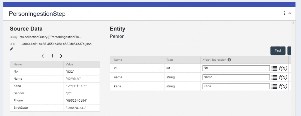 エンティティ作成後、Tableauからのアクセス前にMarkLogicのクエリコンソール上で動作確認をします。 本内容は必須の手順ではありませんが、本トピックの内容を皆様により理解頂けるように記載しております。 テスト用のデータは以下の設定でdata-hub-FINALデータベースに格納しています。 マッピングステップの設定において、手順1で作成したPersonエンティティを指定している事に注意してください。