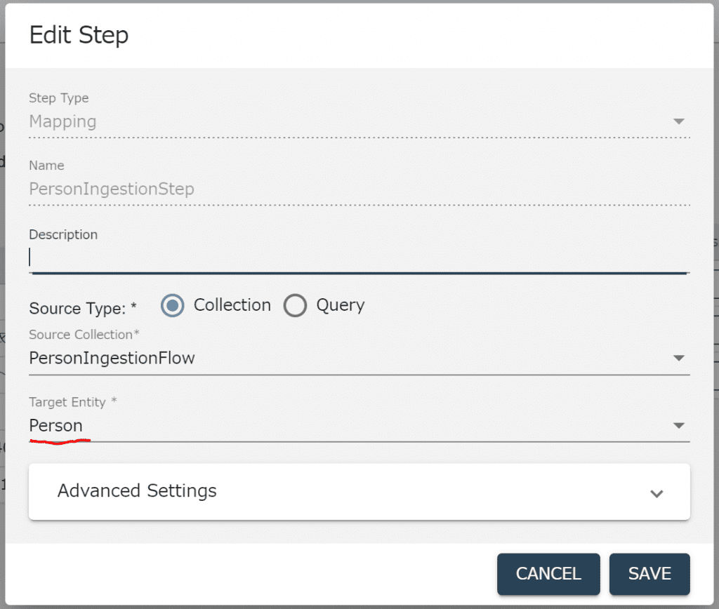 Stagingデータベース上の生データを加工して、Finalデータベースに保存します。 以下の設定以外はデフォルトの設定ととなります。Target EntityがPersonとなっていることで、TDEのテンプレートと実際のデータが紐付けされます。
