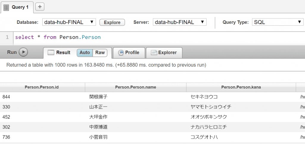Runボタンを押してIngestion stepと Mapping stepを実行します。結果、加工されたデータがFinalデータベースに保存されます。 実際のデータを見てみると、エンティティ名のPersonがデータの内容に反映されています。