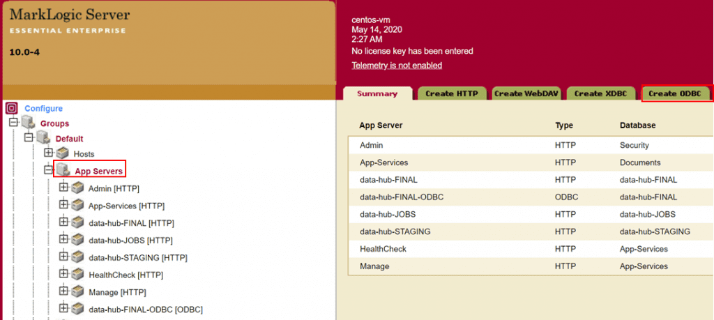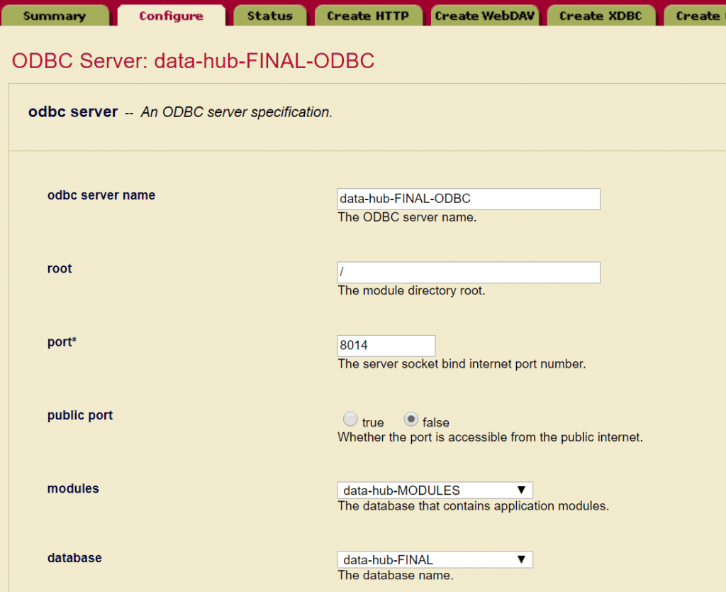 外部ツールなどからTDE経由でアクセスするためには、MarkLogic上にODBCサーバを作成する必要があります。ODBCサーバはTDEでアクセスするデータベース毎に1つ必要です。 以下は、data-hub-FINALデータベース用にポート番号8014番のODBCサーバを立てた例となります。