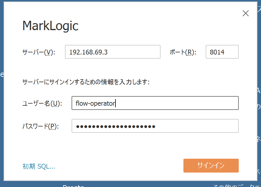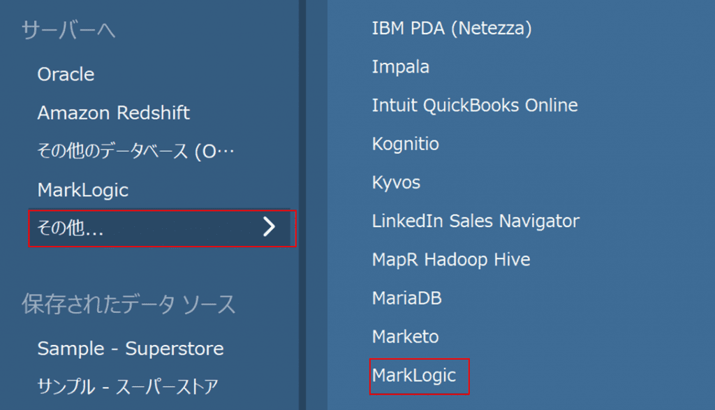 Tableau上では、先ほど設定したMarkLogicのODBCサーバへの接続設定を実施します。 Tableauを起動し、「サーバーへ」内の「その他」、「MarkLogic」を選択します。 ウインドウが出てきますので、接続先ODBCサーバのホスト名(またはIPアドレス)と、先ほどODBCサーバの設定で決めたポート番号、MarkLogicのユーザ名/パスワードを指定してサインインをクリックします。