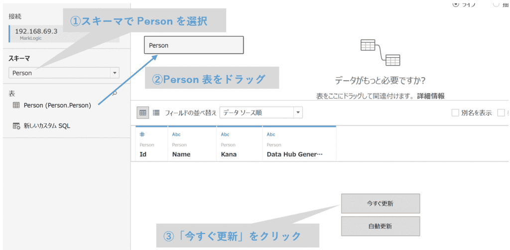 サインインに成功するとこの画面が表示されます。以下の手順に従い、最終的に「今すぐ更新」をクリックすることで、MarkLogic内のでデータがTabelau上に表示されます。
