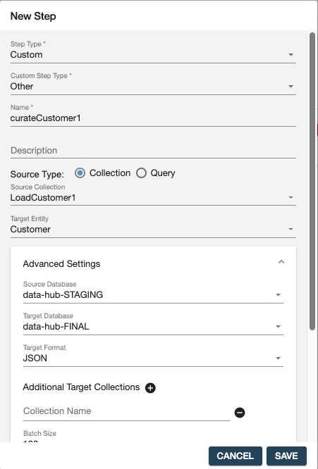 カスタムステップは以下のように、名前をcurateCustomer1 , Source collection はLoadCustomer1を選択し、targetEntityとしてはCustomerを選択してください。 このcurateCustomer1のモジュールは、この後でPipesが自動生成するコードを使用しますので、デフォルトのままにしておいてください。