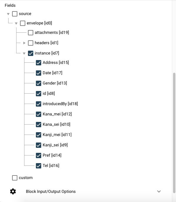 ここでは、Block nameとしてCustomer1Source、ソースデータベースとソースコレクションとして、先ほどと同様にdata-hub-STAGINGとloadCustomer1を選択してください。 これにより下のFieldsにそのコレクション内のデータのプロパティが列挙されます。Fieldsの下のsourceの左側の三角形をクリックしてください。
